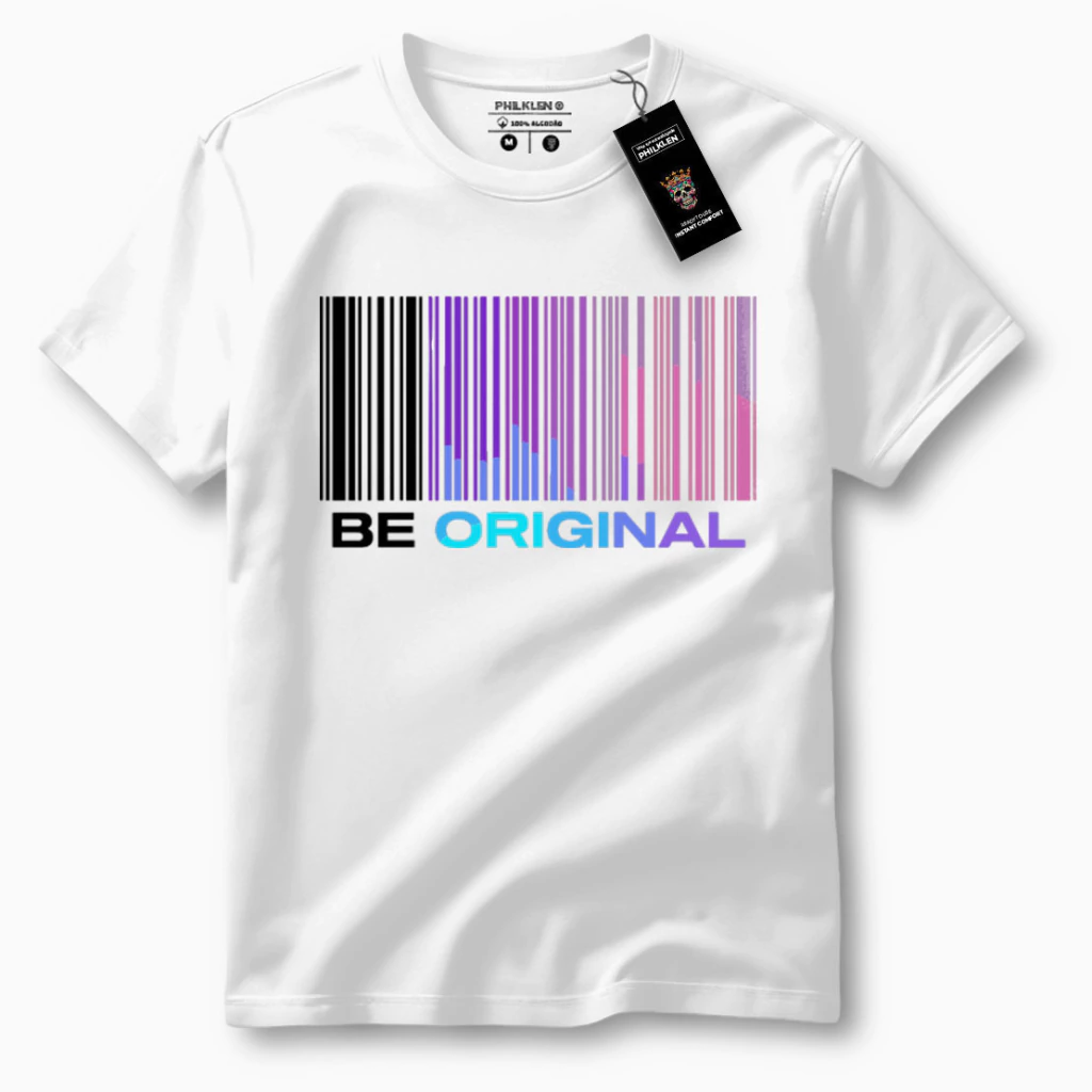 “Seja autêntico com a Camiseta Unissex de Algodão Premium com a Estampa ‘Be Original’ da marca Philklen! Com um design moderno estilo código de barras em cores vibrantes, esta camiseta é a escolha perfeita para quem valoriza originalidade e expressão pessoal. Confeccionada em algodão de alta qualidade, oferece conforto e durabilidade para o dia a dia. Ideal para compor looks descolados e cheios de atitude. Mostre seu estilo único e autêntico!”