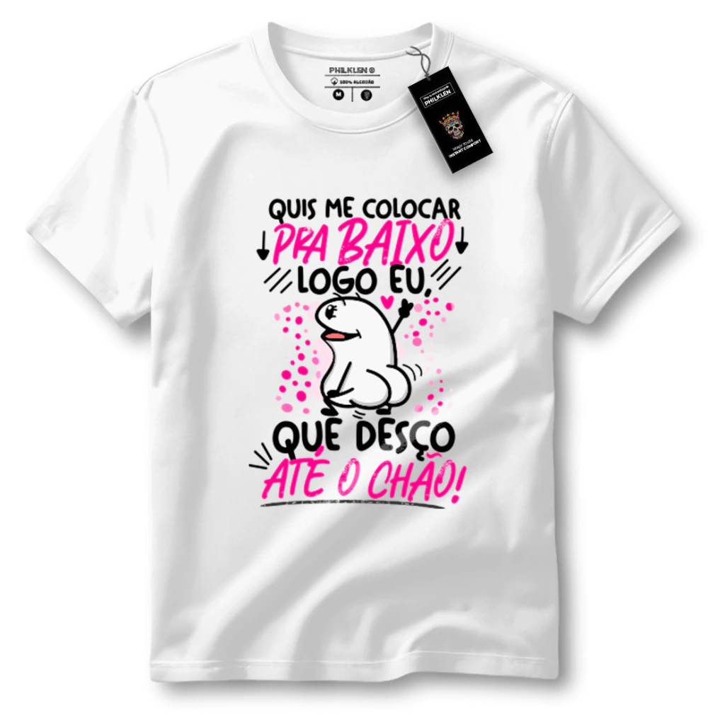 Apresentamos a nossa camiseta feminina de algodão Premium, divertida e ousada "Quis me colocar pra baixo! Logo eu, que desço até o chão!" da marca Philklen! Com um fundo branco clean, essa peça cativante traz uma estampa cômica que promete arrancar risadas e chamar a atenção. O design apresenta um personagem engraçado junto a um texto cheio de personalidade, perfeito para quem adora expressar seu humor e autenticidade. Confeccionada em 100% algodão Premium de alta qualidade, oferece conforto e leveza, tornando-se ideal para o uso diário. Adicione uma dose de diversão ao seu estilo com esta camiseta única!