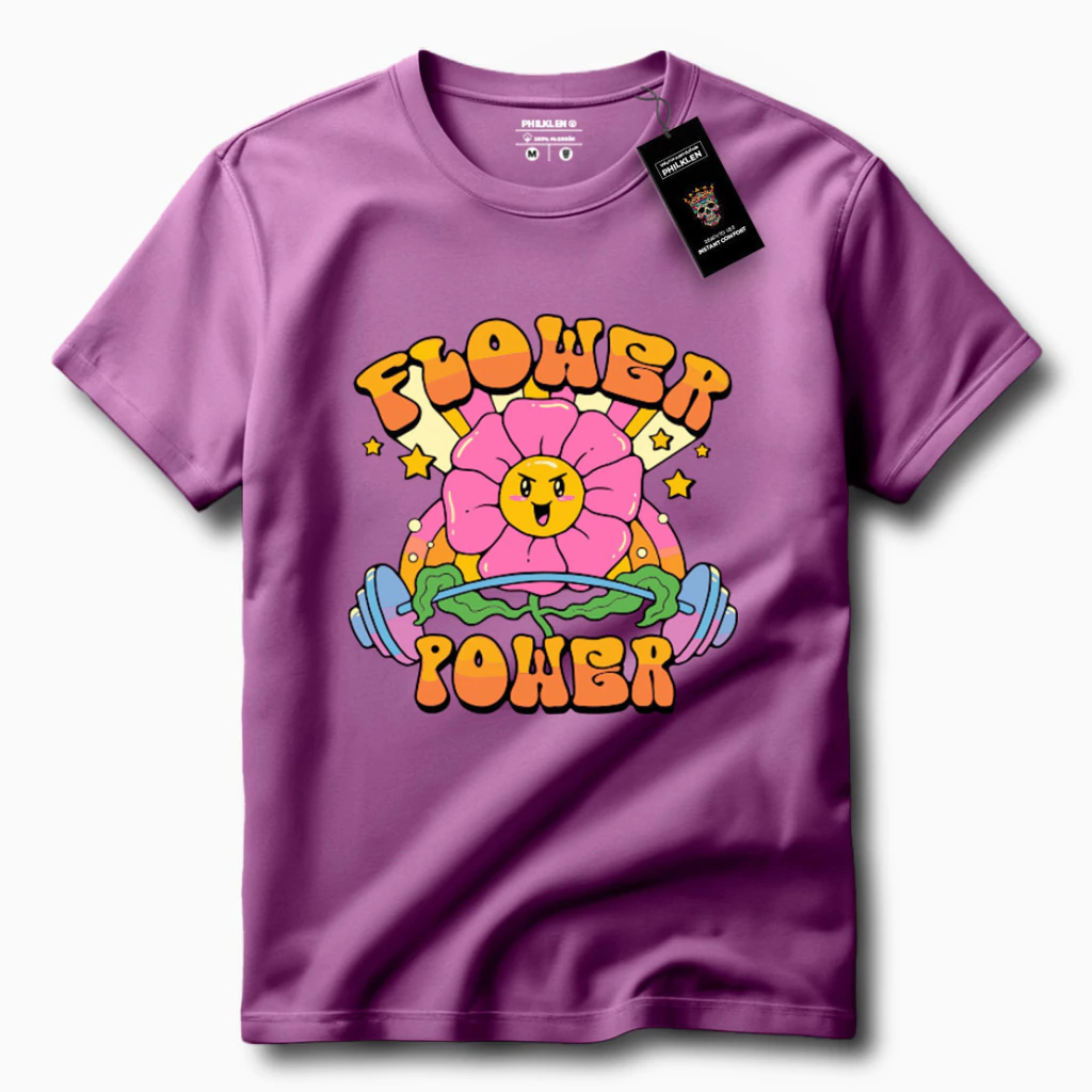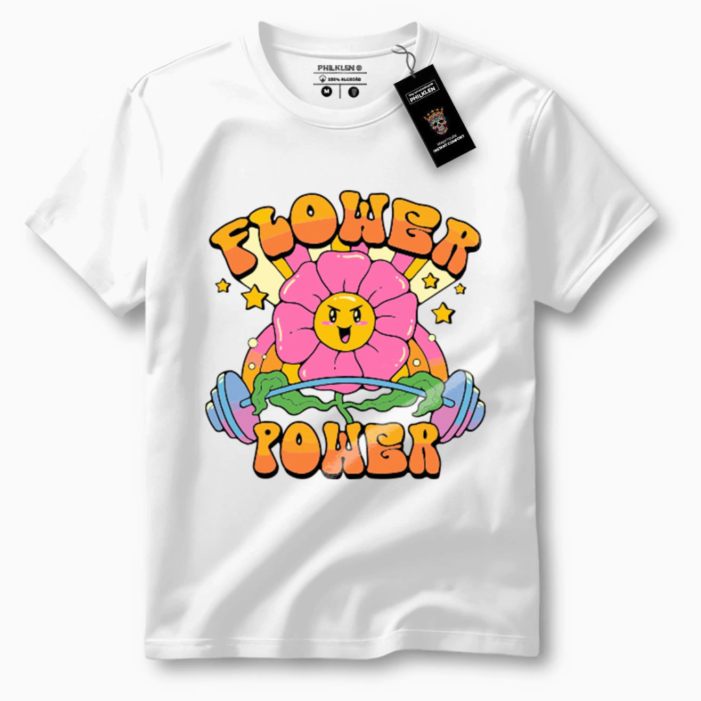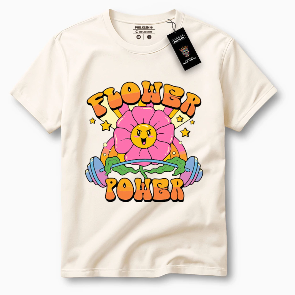 Com um design moderno e cheio de humor, essa camiseta traz uma flor estilizada com rosto sorridente e halteres, mostrando que até as flores podem ser fortes! A frase "Flower Power" em destaque e os elementos gráficos retrô completam o visual divertido e cheio de referências à estética dos anos 70.