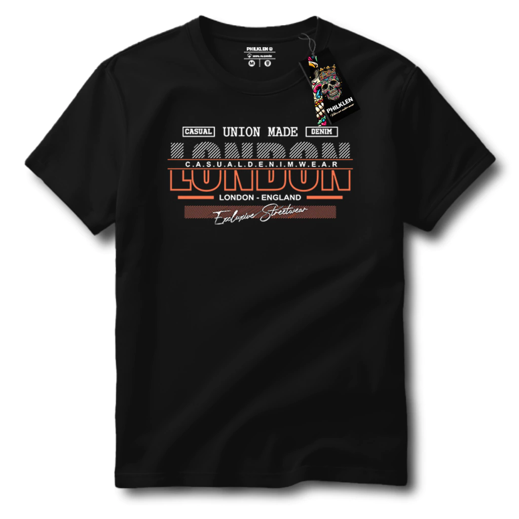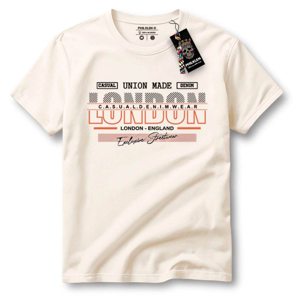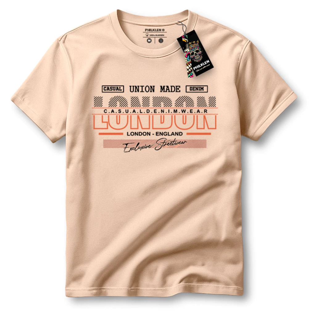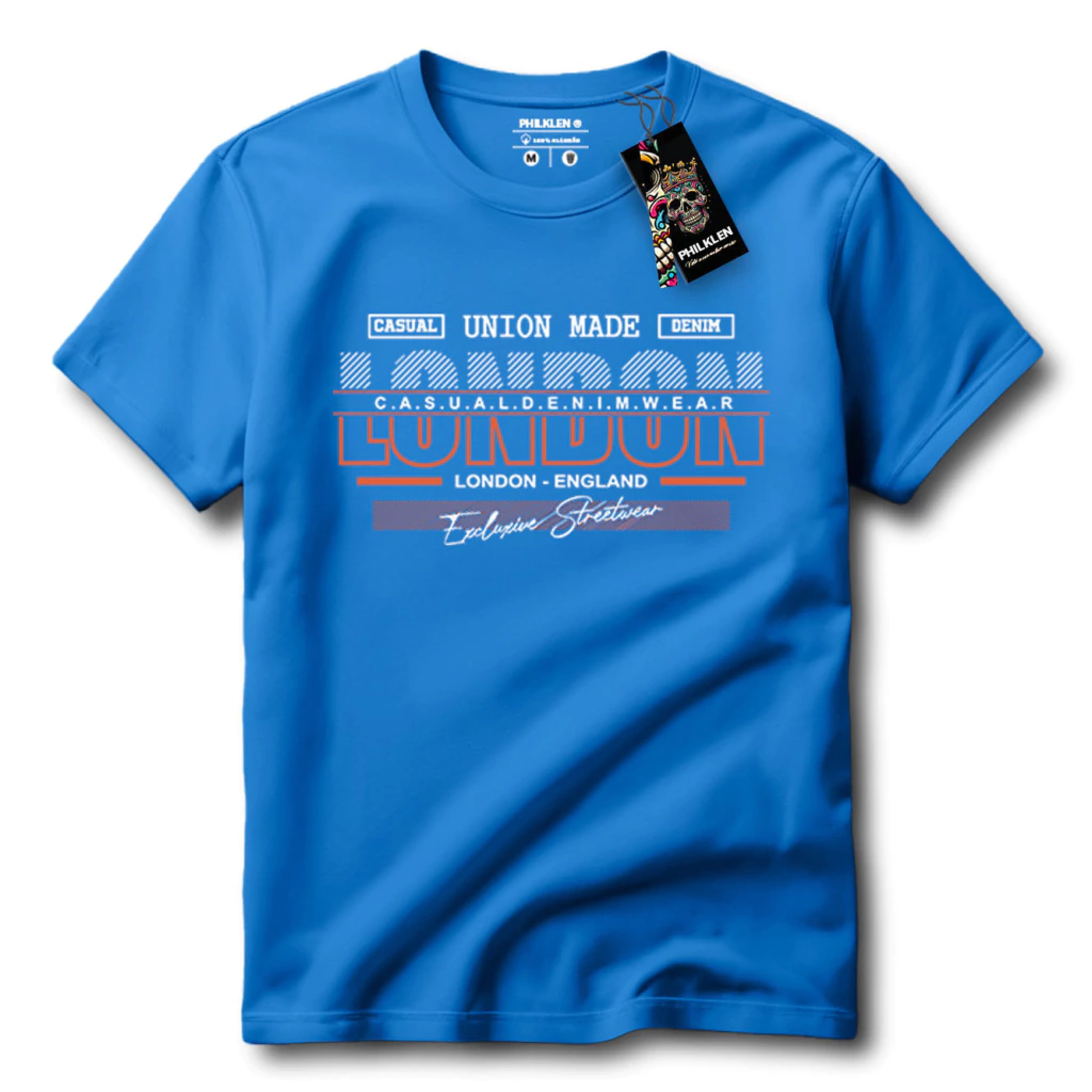 Com um design moderno e cheio de personalidade, essa camiseta traz a icônica frase "LONDON - ENGLAND" com detalhes que remetem à cidade, como linhas geométricas e cores vibrantes. Além disso, as palavras "CASUAL UNION MADE DENIM", "C.A.S.U.A.L.D.E.N.I.M.W.E.A.R" e "Excluzive Streetwear" adicionam um toque autêntico e cheio de estilo urbano.