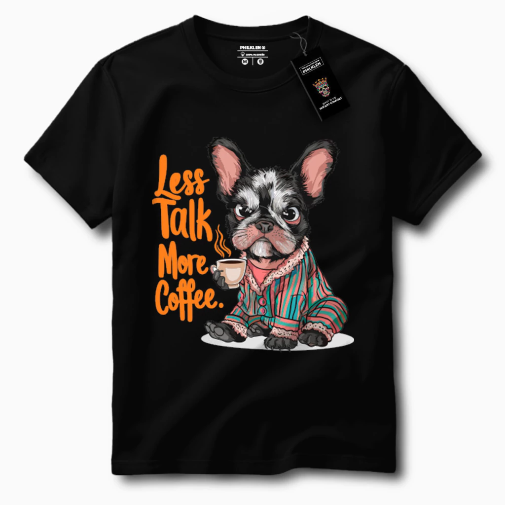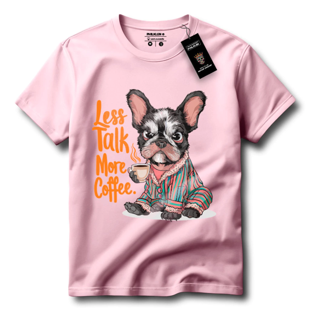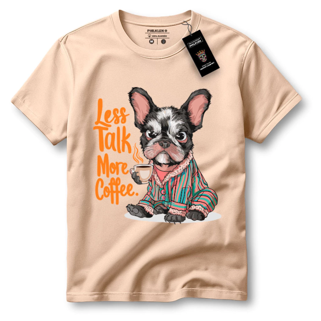Apresentamos a nossa divertida Camiseta Unissex de Algodão com Estampa "Less Talk More Coffee" da marca Philklen! Em um tom suave de creme, essa camiseta traz uma ilustração encantadora de um bulldog francês vestido com pijamas e segurando uma xícara de café, perfeita para quem ama animais e não dispensa um bom café. Com seu design divertido e a frase cativante, essa peça vai arrancar sorrisos por onde você passar! Confeccionada em algodão 100% de alta qualidade, ela proporciona conforto, respirabilidade e um caimento ideal para o uso diário. Adicione um toque de humor e charme ao seu guarda-roupa com essa peça irresistível da Philklen!